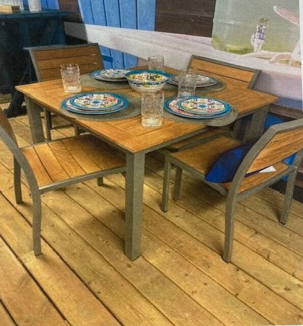 36″ Teak w/ 4x Stacking Chairs in Teak & Silver